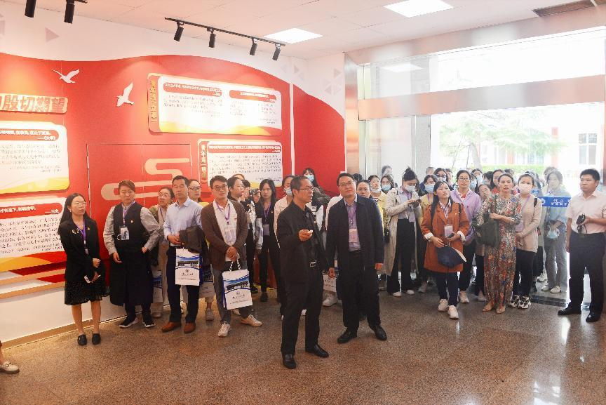 2022年11月3日上午,广西科技师范学院领导一行近百人到yl23411永利参观党建文化宣传长廊、三全育人示范院系建设阵地、清廉学院建设阵地。学院党委书记梁军、院长龙飞陪同并讲解。