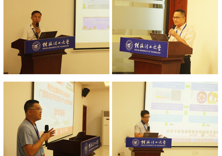 在产业学院建设发展研讨会阶段,广西南南铝加工有限公司热轧技术站站长兼船舶材料研究所副所长赵启忠、广西特钢新材料重点实验室主任及广西北港新材料有限公司技术中心副主任黄学忠、中国有色桂林矿产地质研究院有限公司生态环境研究所固废处理中心主任冯吉福和yl23411永利集团官网教授喻亮共四位专家分别做了海洋工程用耐蚀5系铝合金板材制备技术研究、在线轧退洗一体化生产高品质不锈钢带关键共性技术研发应用、广西某低品位氧化锌矿浮选研究和双联通结构Al2O3 3D/Al复合材料的耐磨及耐蚀性能的学术报告。