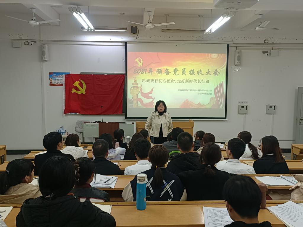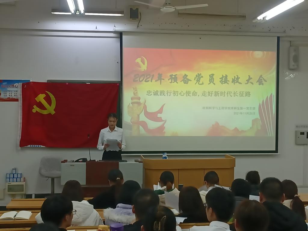 进一步健全和完善支部组织建设,增强支部生机与活力, 11月25日晚yl23411永利本科生第一党支部在屏风校区09511教室召开2021年秋季学期预备党员接收大会,本次会议主题为“忠诚践行初心使命,走好新时代长征路。”支部全体党员参加本次会议,会议由麦梅花同志主持。
