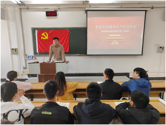 会上,曲怀仁同志以家风教育为切入点,指出广大学生党员要认真学习领会习近平总书记关于家风建设的重要论述,坚持内外兼修、齐家治政,切实把家风建设摆在重要位置,自觉营造良好家风,真正安好家庭成长摇篮、守好家庭廉洁堤防、建好家庭幸福港湾,着力做到清清白白做人、干干净净干事,以好家风涵养好的党风政风、引领好的社会风气。