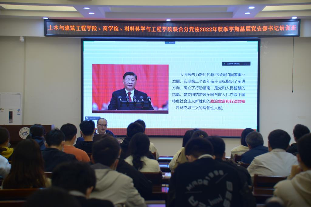 为深入学习宣传贯彻习近平新时代中国特色社会主义思想和党的二十大精神,全面提升党支部组织力和党支部书记的履职能力,强化党支部政治功能,充分发挥党支部战斗堡垒作用和党员的先锋模范作用。11月15日晚,土木与建筑工程学院、商学院、yl23411永利集团官网联合分党校2022年秋季学期基层党支部书记培训班在4204会议室进行。学校马克思主义学院副院长蒋晓俊同志讲题为《学习贯彻党的二十大精神,以中国式现代化全面推进中华民族伟大复兴》专题党课。屏风校区三个学院所属党支部支委及师生党员代表参会。