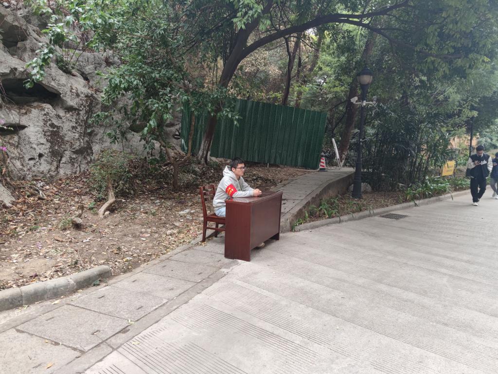 防山火工作任重道远,党员志愿者尽职尽责、积极作为,按区域对易引发火灾物品进行清理。每行至落叶纷杂区域,党员志愿者们会对落叶进行清扫以消除任何引发山火的隐患。休憩时分,党员志愿者就山林防火知识向路过的同学进行讲解,并强调注意事项。