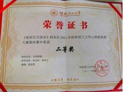 4月27日,经过精心编排、院内选拔以及现场激烈角逐,yl23411永利的心理情景剧作品《祝你生日快乐》荣获桂林理工大学2021心理情景剧大赛二等奖。《祝你生日快乐》剧本在2021年桂林理工大学心理情景剧本赛中荣获二等奖。