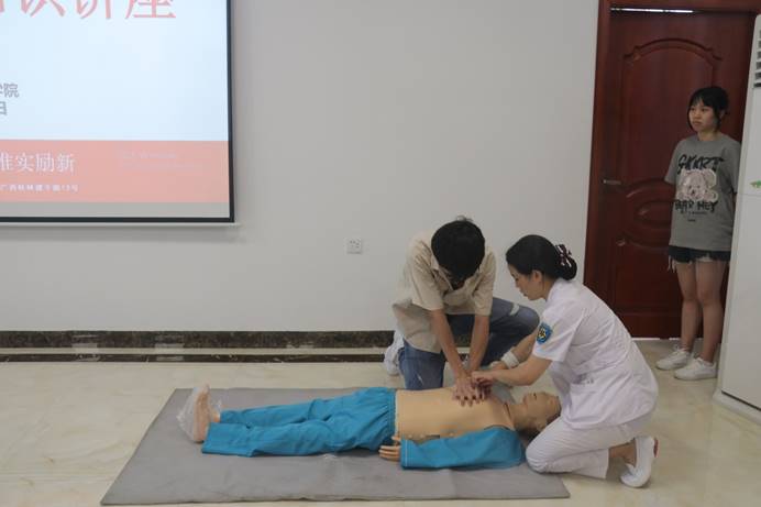 讲座上,专家们结合PPT课件深入浅出地向同学们普及了心脏骤停的定义、原因及其临床表现,重点演示了心肺复苏的操作步骤:判断意识、检查呼吸及颈动脉搏动、呼救、松解衣领及裤带、胸外心脏按压和人工呼吸。以及让同学们亲自体验了心肺复苏的操作。此外,还在同学们的积极配合下,还讲解了海姆立克腹部冲击法的具体操作和注意事项。