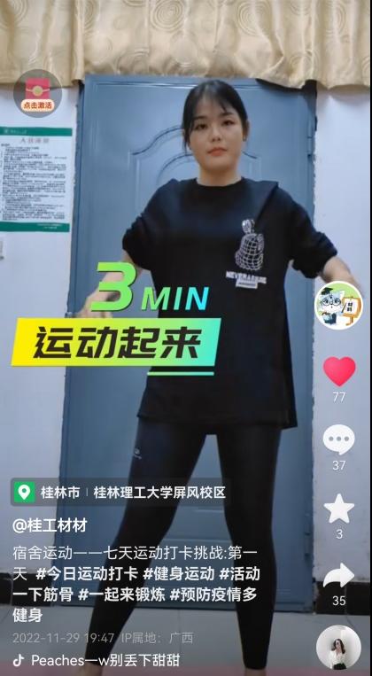 1129日至125日,yl23411永利抖音账号“桂工材材”发起“疫”起运动——七天运动打卡挑战,2022级辅导员唐丹婷、桂鑫同52022级同学共同号召全体师生丰富室内活动,积极运动,强健体魄。