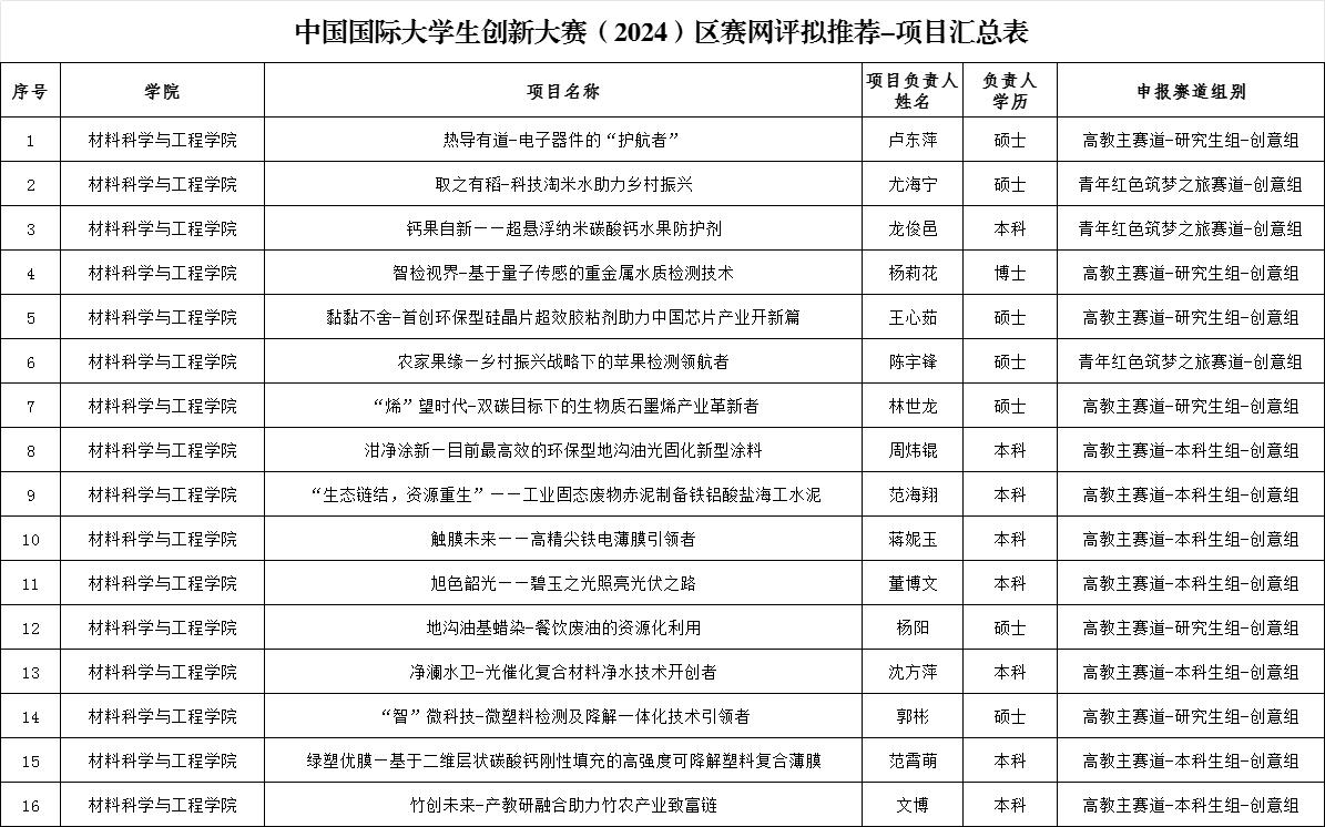 作为学校科研与创新的排头兵,院始终秉持“创新驱动发展,科技引领未来”的理念,致力于为学生搭建广阔的实践平台,激发他们的创新潜能。此次推荐的16项目,不仅是学院师生智慧与汗水的结晶,更是学院科研实力和创新能力的生动体现。这些项目横跨材料科学的多个前沿领域,从新型功能材料的研发到绿色制造技术的应用,从智能材料的探索到环境友好材料的创新,每一项都凝聚着学院师生的心血与期待。