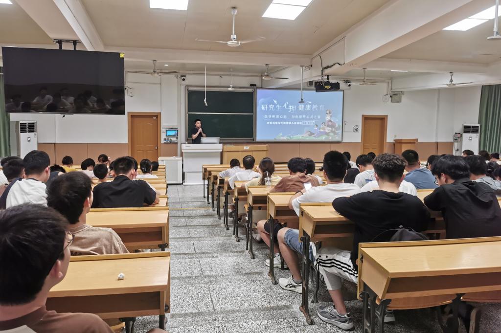 韦孝鹏老师从心理健康的标准、现阶段心理特点、心理健康的维护、让青春更美好四个方面进行了深入细致的讲解。他指出,学业压力大、科研进展缓慢、缺乏长期目标、没有近期规划、对未来感到迷茫等是现阶段研究生面临的普遍问题,主动学习心理健康知识、积极参与有益于心理健康的活动、加强自我情绪调节、积极与人交流、学会寻求心理咨询帮助等,是研究生缓解心理压力、进行自我调适的有效途径。随后,他耐心地指导同学们如何进行心理健康的维护、怎样求助心理医生,并现场演示了如何预约学校心理咨询服务。最后,韦孝鹏老师现场开展了一场情绪体验活动,引导同学们面对情绪问题时,可以通过“换个角度试试看”“表情调节法”“转移注意力”和“深呼吸”等方式自主调节情绪。