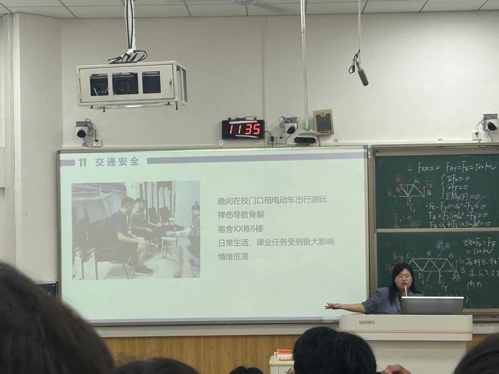 赵思聪老师首先传达了假期安排,强调请销假制度的重要性,要求同学们在外活动时遵循学校规定,未经批准不得私自离校。同时,他提醒同学们外出时要及时向班主任或辅导员报备,以便有效管理。董子胜在现场强调了防溺水、防诈骗及出行安全,通过生动案例分享了因疏忽造成的事故,强调国庆假期游玩时要注意加强防范,务必结伴而行,警惕网络诈骗,在遇到难以处理的情况时及时向老师求助。