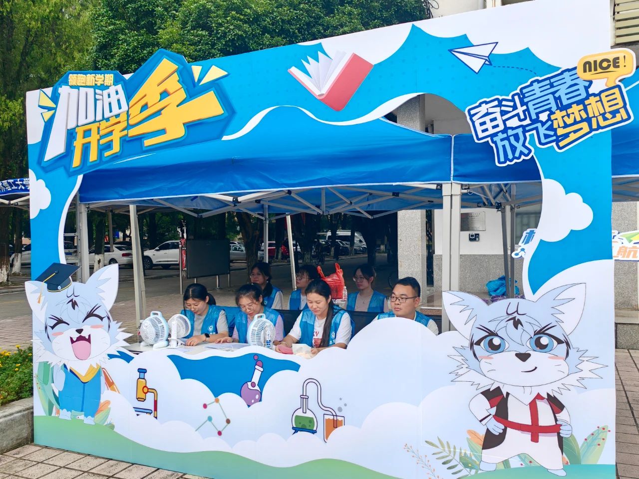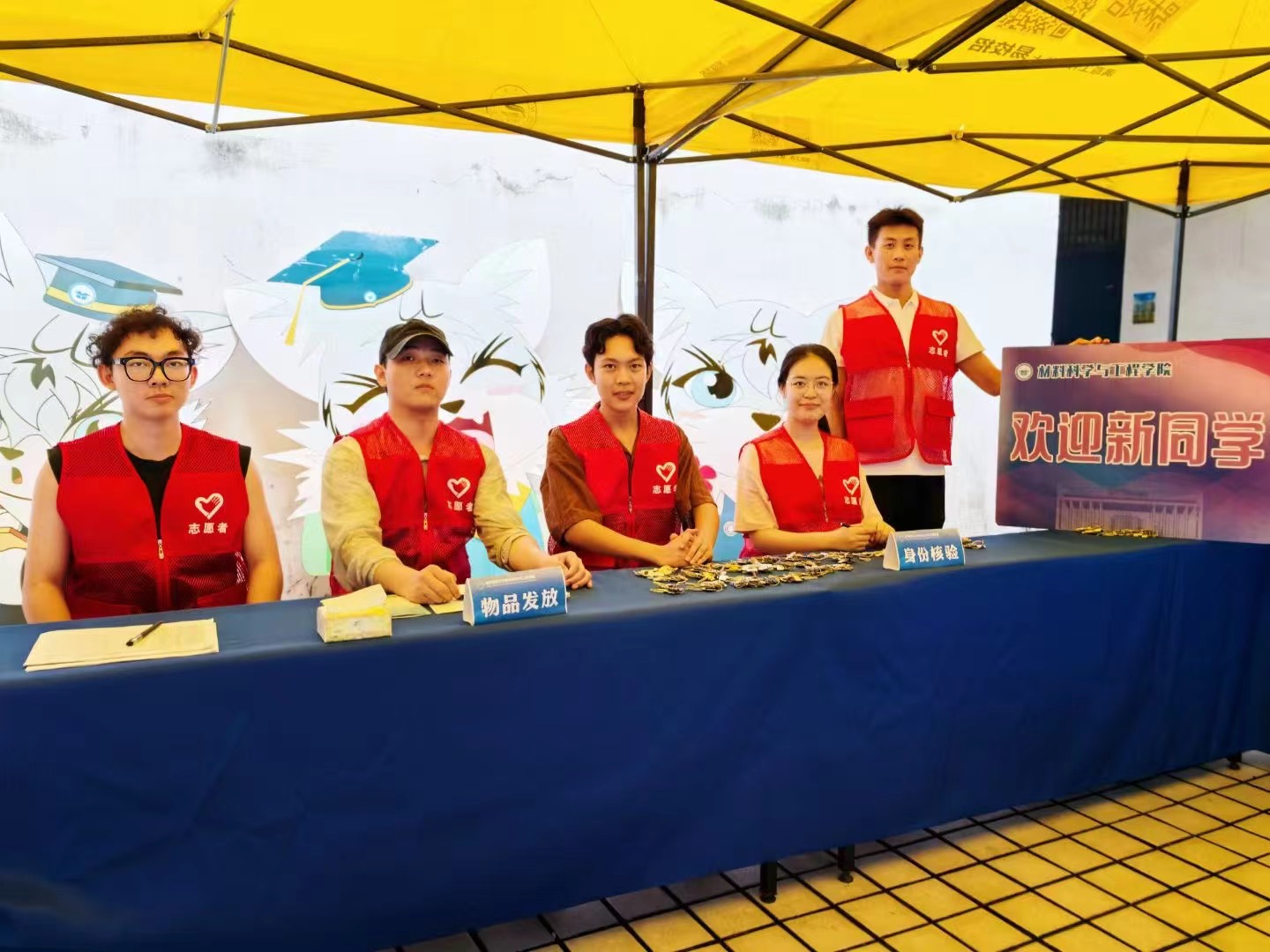 志愿者们在6栋迎新点紧张筹备