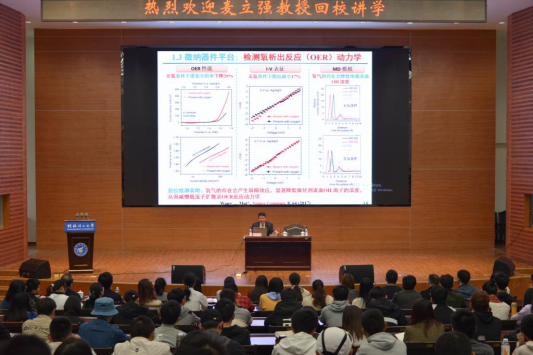 麦立强教授首先向师生们介绍了20余年来自身科研工作经历和部分代表性研究成果,并通过生动的科研故事,分享了“勤奋求实、积极开拓”这个他在面临科研难题时取得进展和突破的“金钥匙”,以及以兴趣为牵引、以能力培养为核心的育人心得。最后,麦立强教授就相关科研问题与同学们进行了互动交流。
